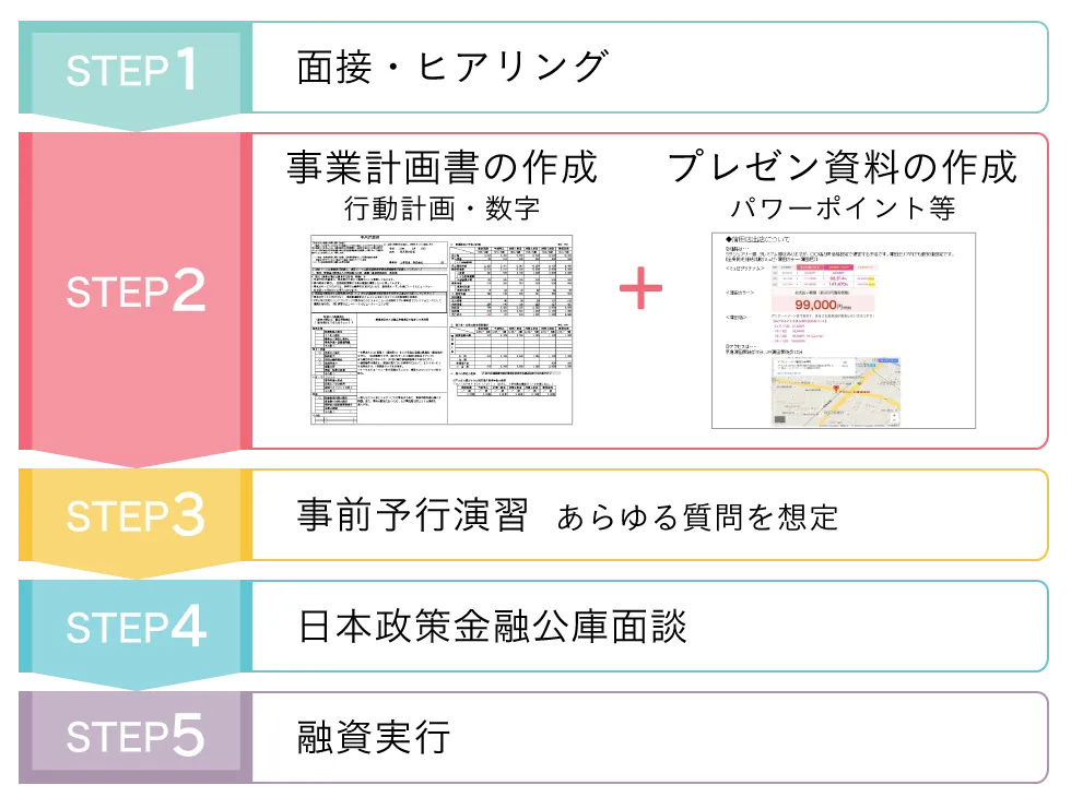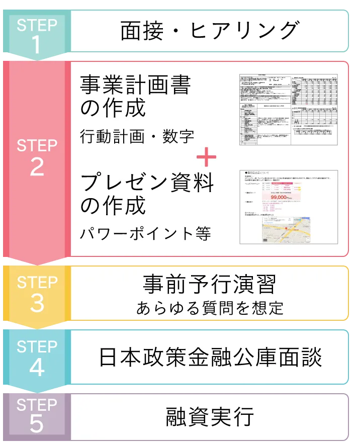 ※1日本政策金融公庫での面談ではなく、当事務所にて面談を行うので、安心です。